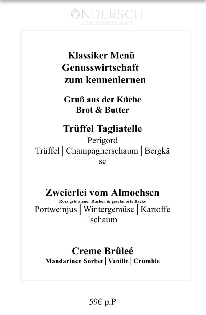 Nur für kurze Zeit 3 Gänge Empfehlungsmenü Trüffeltagliatelle, zweierlei vom Almochsen und eine leckere Crème brûlée inklusive Wein. Telefonisch reservieren Per E-Mail Reservieren Scroll TO Menu